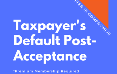 Default After Acceptance. A taxpayer must honor all terms set forth in the Form 656 agreement. Form 656, Section 7, https://www.irs.gov/pub/irs-pdf/f656b.pdf. In particular, a taxpayer must comply with all filing and payment obligations under the Tax Code for a period of 5 years after the offer is accepted. Form 656,…